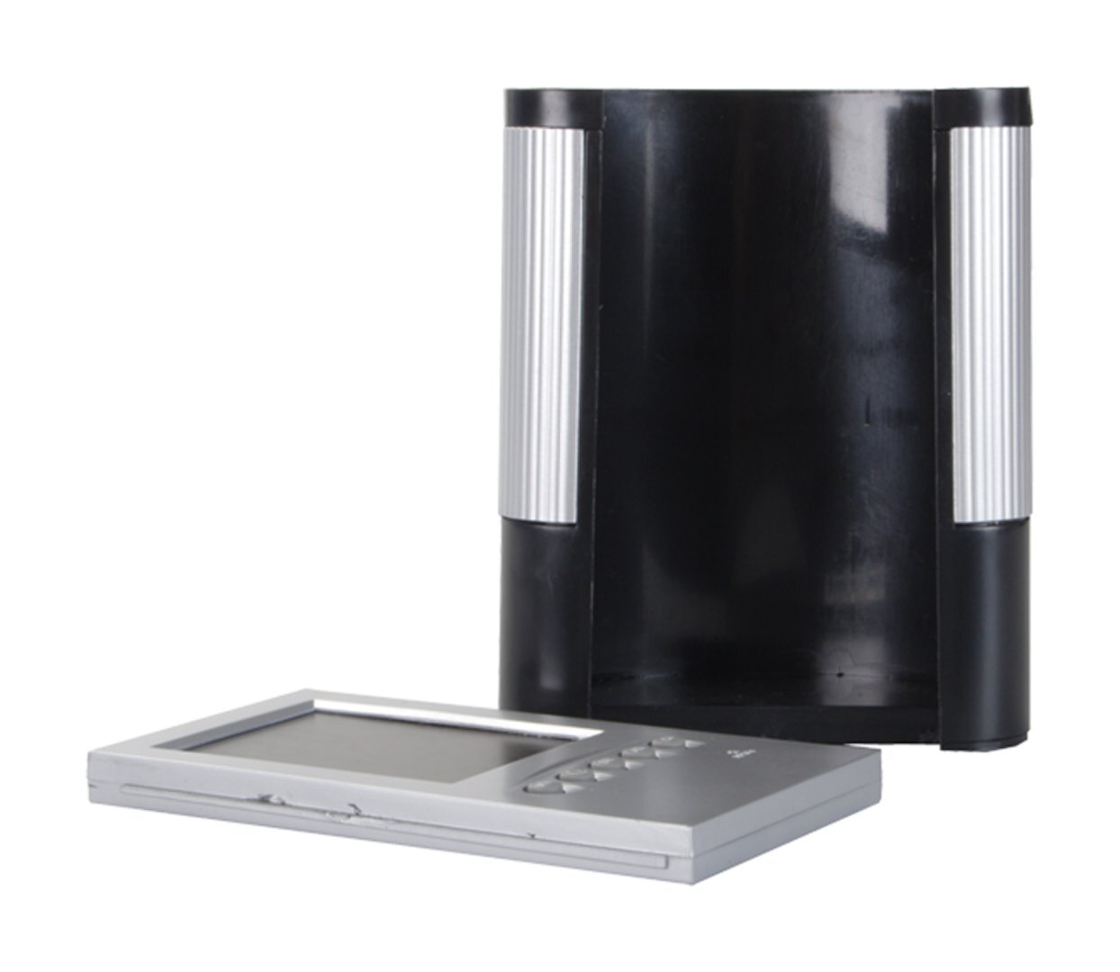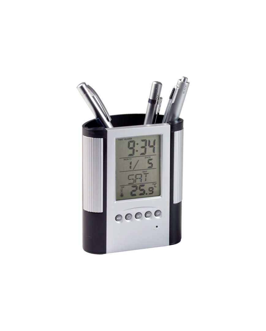 Fekete/ezüst, műanyag tolltartó, digitális kijelzővel, (a kijelző rész levehető) mely mutatja az időt, hőmérsékletet, dátumot. Ébresztő funkciója is van. 1 db gombelemmel szállítjuk.