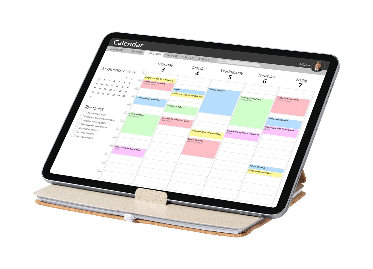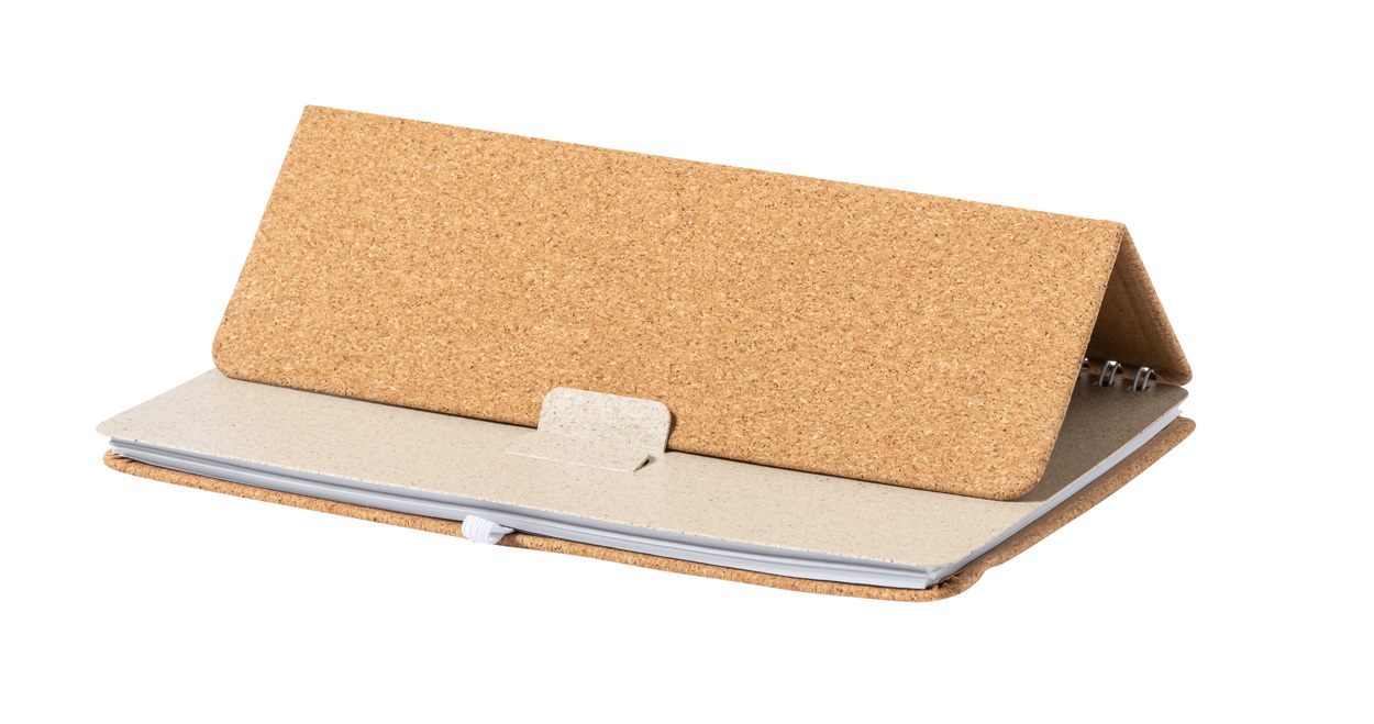 Természetes parafa borítású spirál jegyzetfüzet búzaszalma műanyag mobil és tablet tartó résszel. 70 vonalas lappal és gumipánttal. A5 méretű.