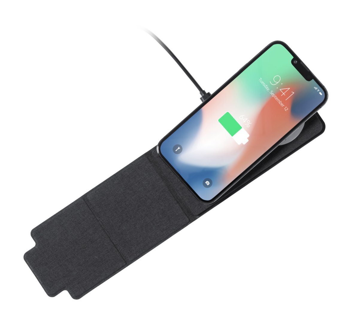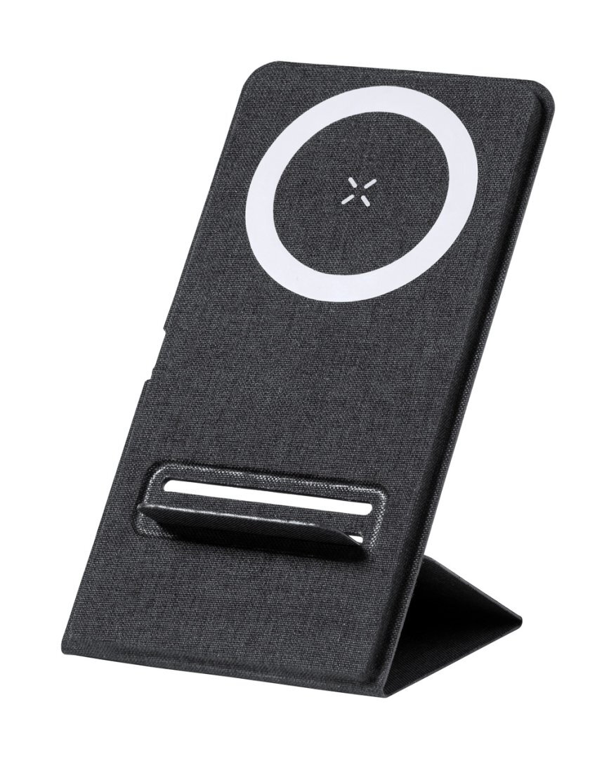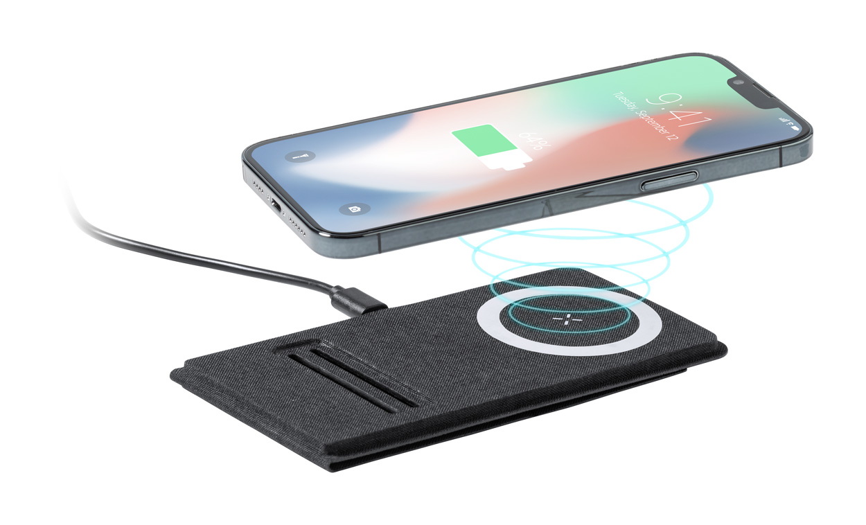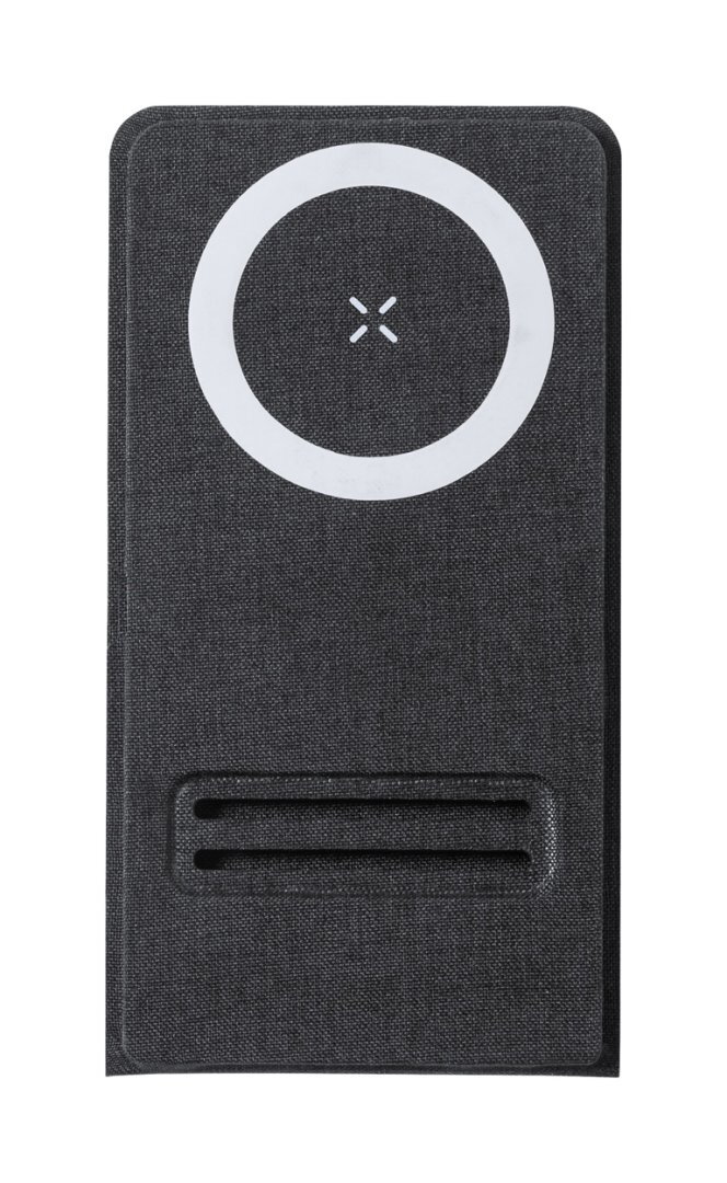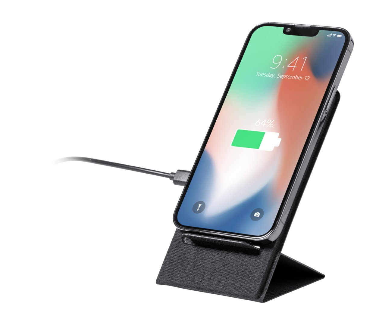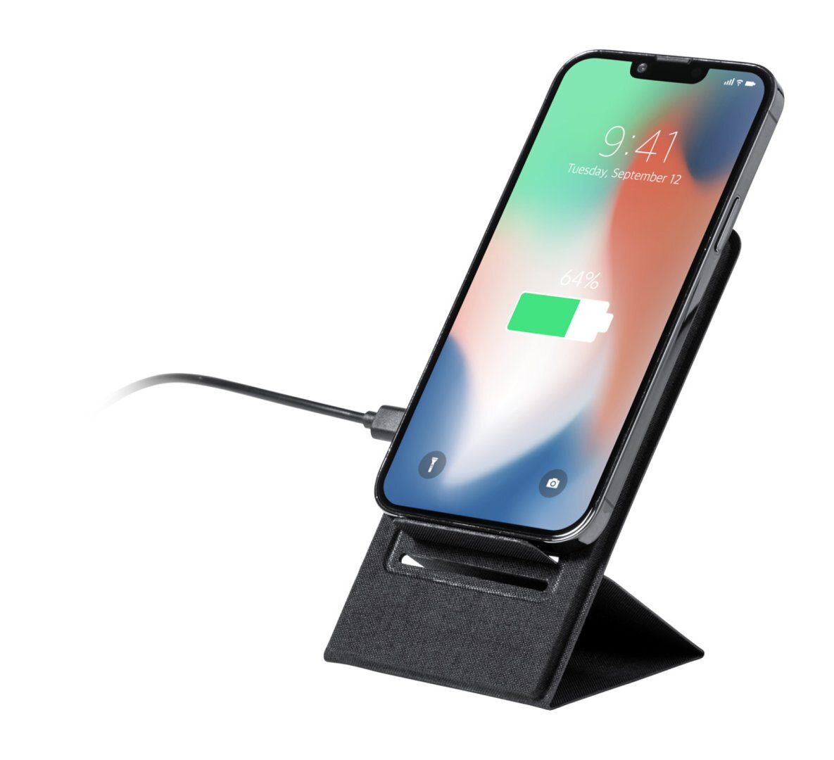 Összecsukható, 300D RPET poliészter mobiltelefon-tartó beépített vezeték nélküli gyorstöltővel (15 W). Öntapadós fémgyűrűvel, mely minden vezeték nélküli töltővel ellátott eszközzel alkalmazható. USB töltőkábellel szállítjuk.