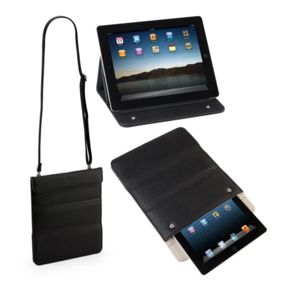 iPad® tartó tok, mely használható nyakba akasztva és asztalra téve is. Anyaga: PU.