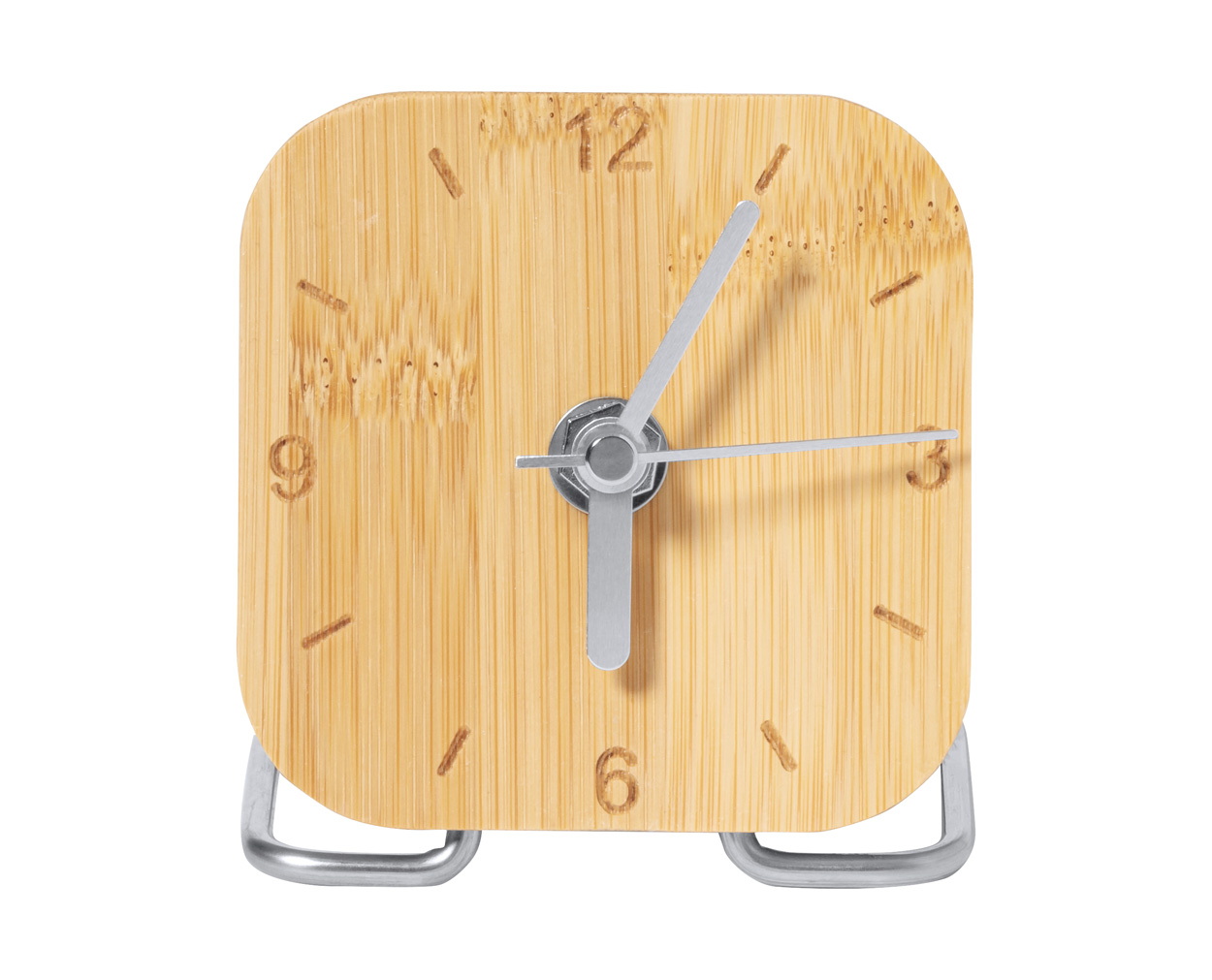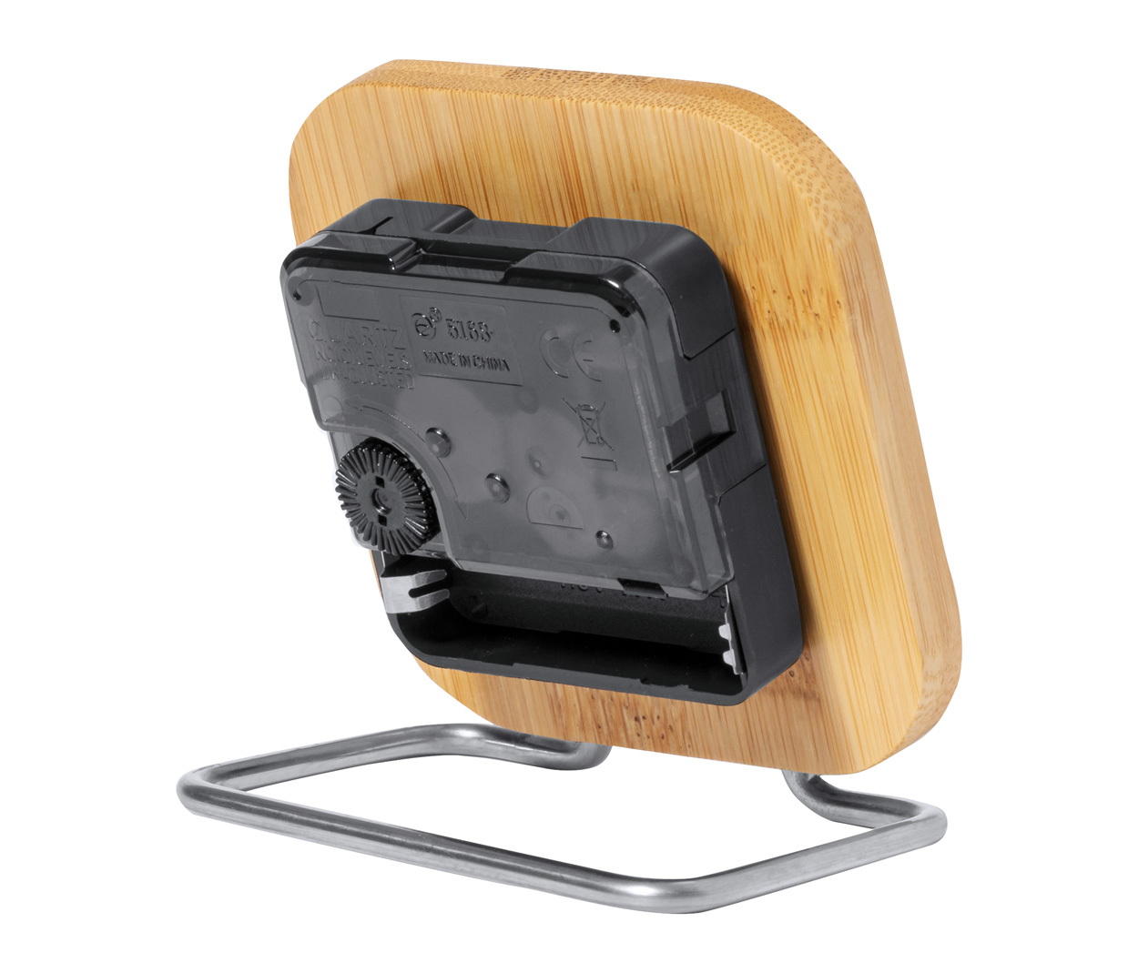 Bambuszból és rozsdamentes acélból készült asztali óra. 1 db AA elemmel működik, elem nélkül szállítjuk.