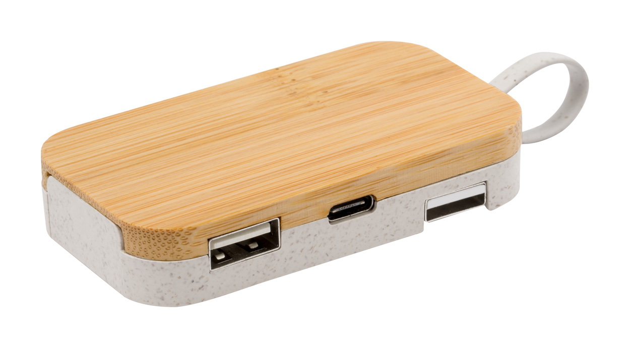 Bambusz és ökológiai búzaszalma műanyag USB hub mobiltartó funkcióval. 2 USB és 2 USB-C porttal, USB 2.0. USB és USB-C csatlakozós kábellel szállítjuk.