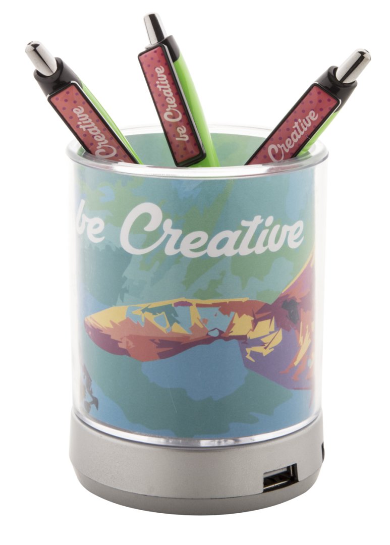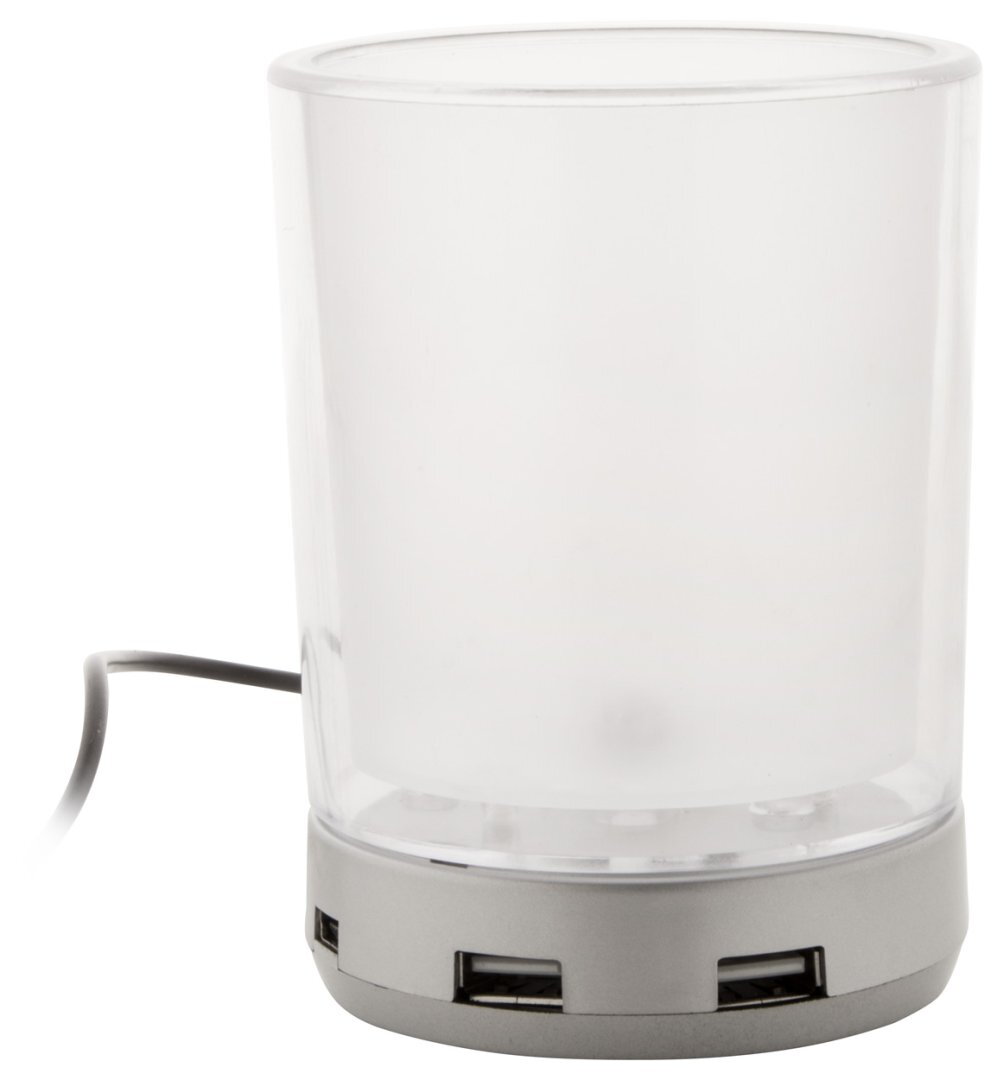 4 USB (2.0) kimeneteles asztali tolltartó, kék fénnyel világít. A tolltartó 2 fala közé egyedi nyomtatott grafika helyezhető. Anyaga: ABS.
