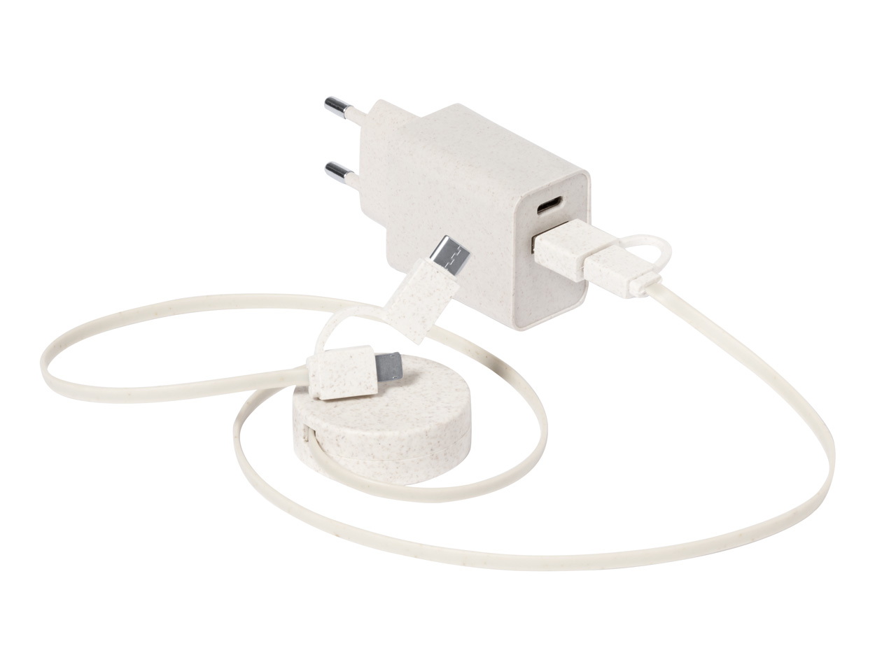 Ökológiai búzaszalma műanyag USB töltő szett pamut tasakban. Tartalma: fali USB gyorstöltő 1 USB és 1 USB-C porttal, 2 pólusú európai csatlakozóval, gyorstöltési funkcióval (PD20W / QC3.0) és egy teleszkópos USB töltőkábel mikro USB, USB-C és Lightning csatlakozókkal, USB és USB-C bemenetekkel.
