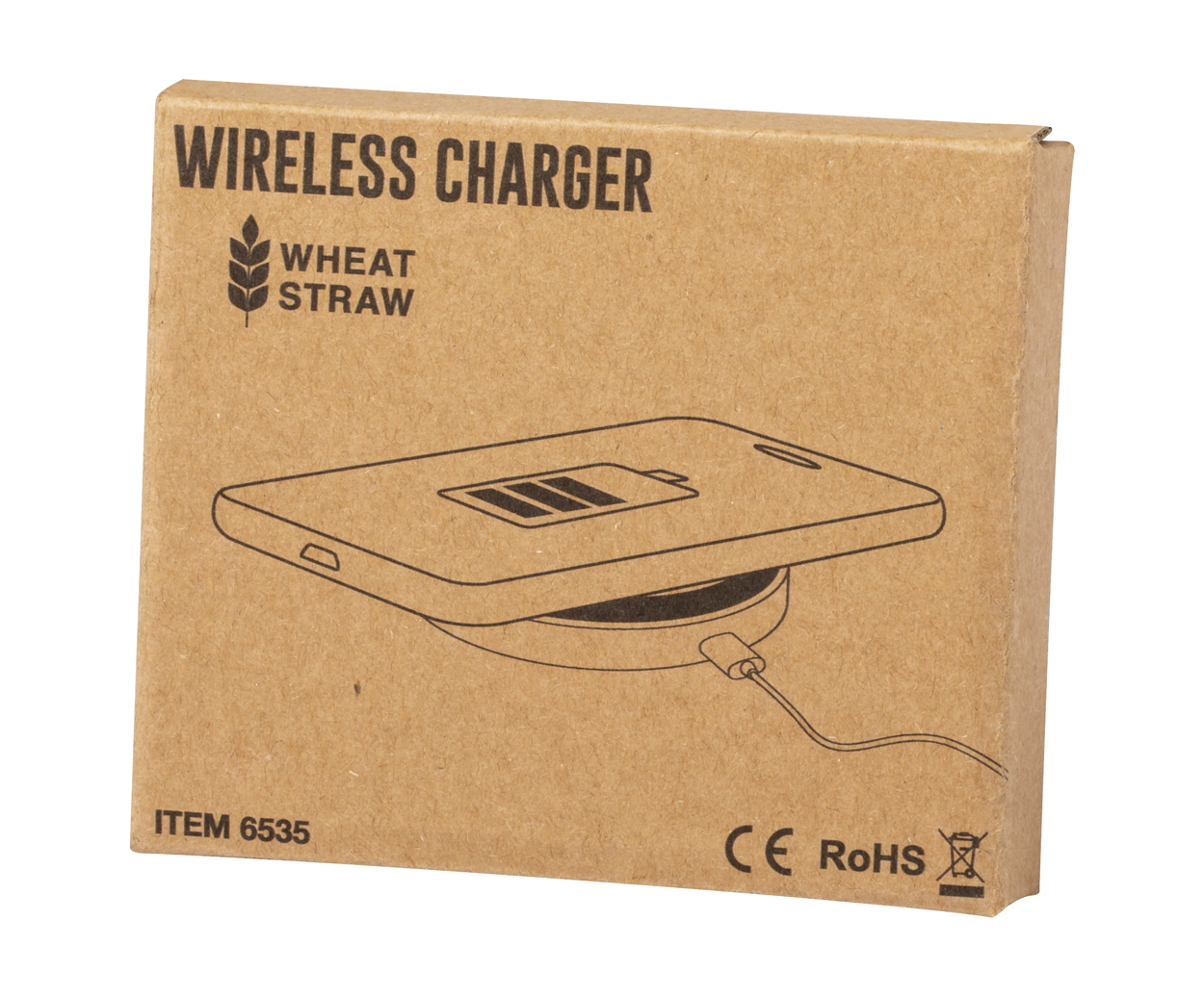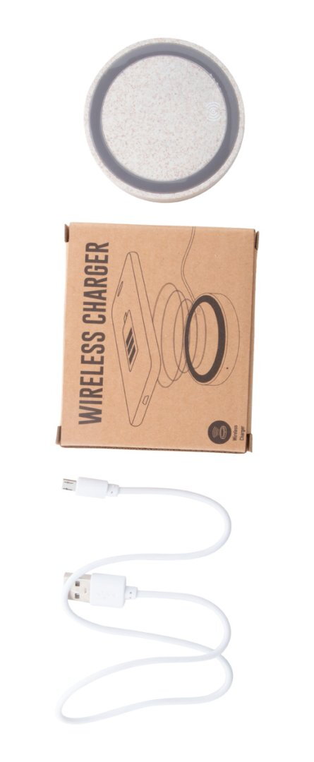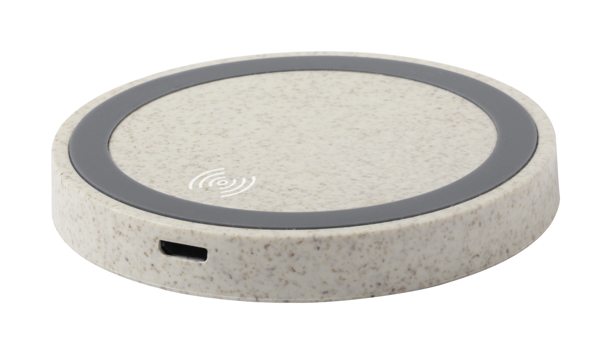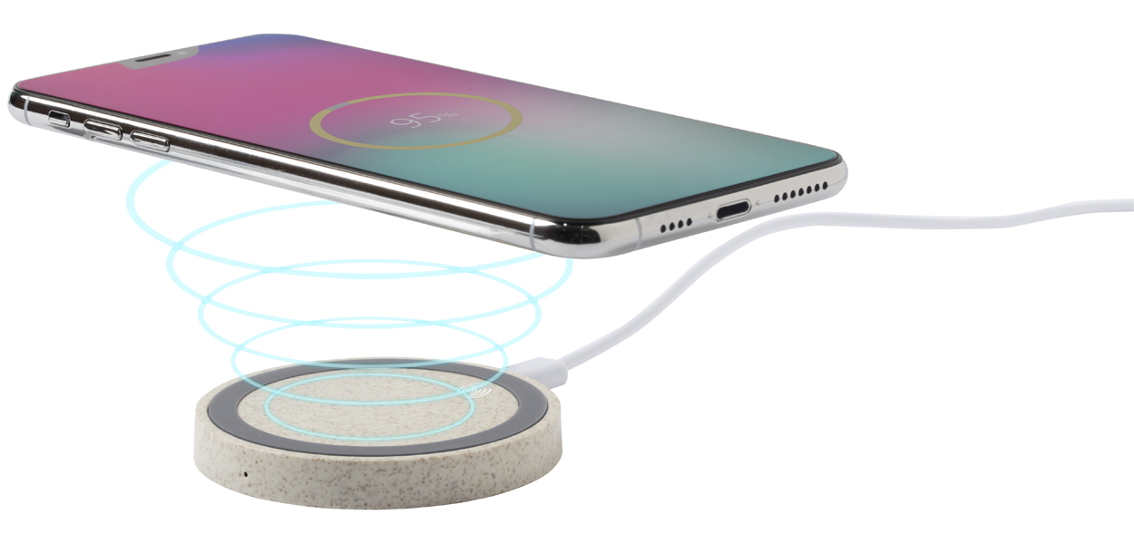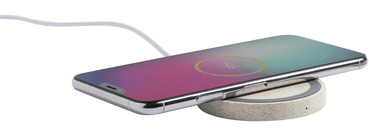 Vezeték nélküli töltő kör alakú, környezetbarát búzaszalma műanyag borítással és csúszásgátlóval. Max. output: 1000 mA. USB kábellel szállítjuk.