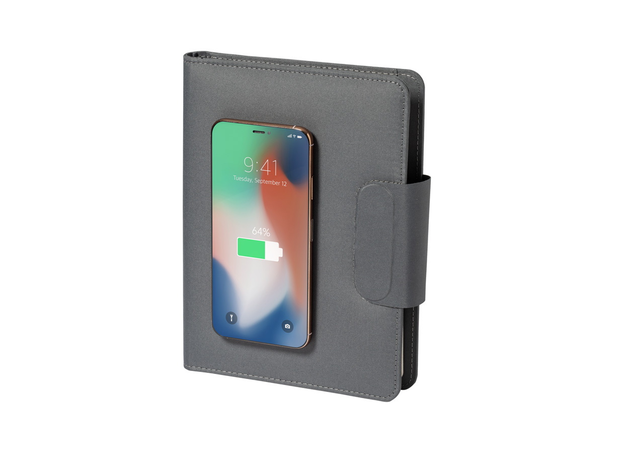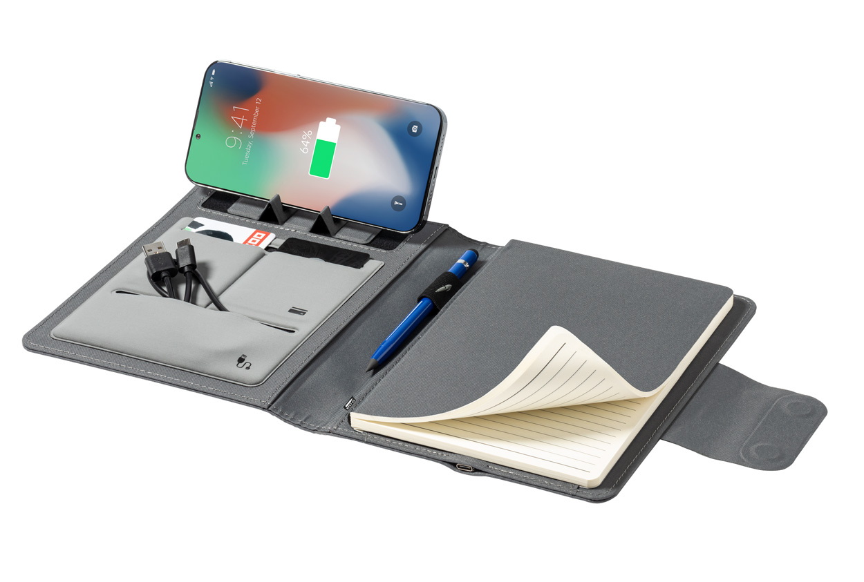 A5 méretű, 300D RPET poliészterből készült iratmappa. Beépített, mágneses vezeték nélküli töltővel (10W), 5000 mAh akkumulátorú power bank-kal és USB bemenettel ellátva. Egy összehajtható mobiltelefon-tartót és 65 vonalas lapot tartalmaz. Öntapadós fémgyűrűvel, ami minden vezeték nélküli töltővel ellátott eszközzel használható. USB töltőkábellel szállítjuk.