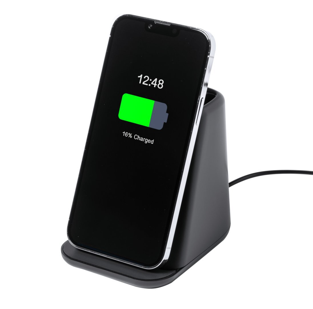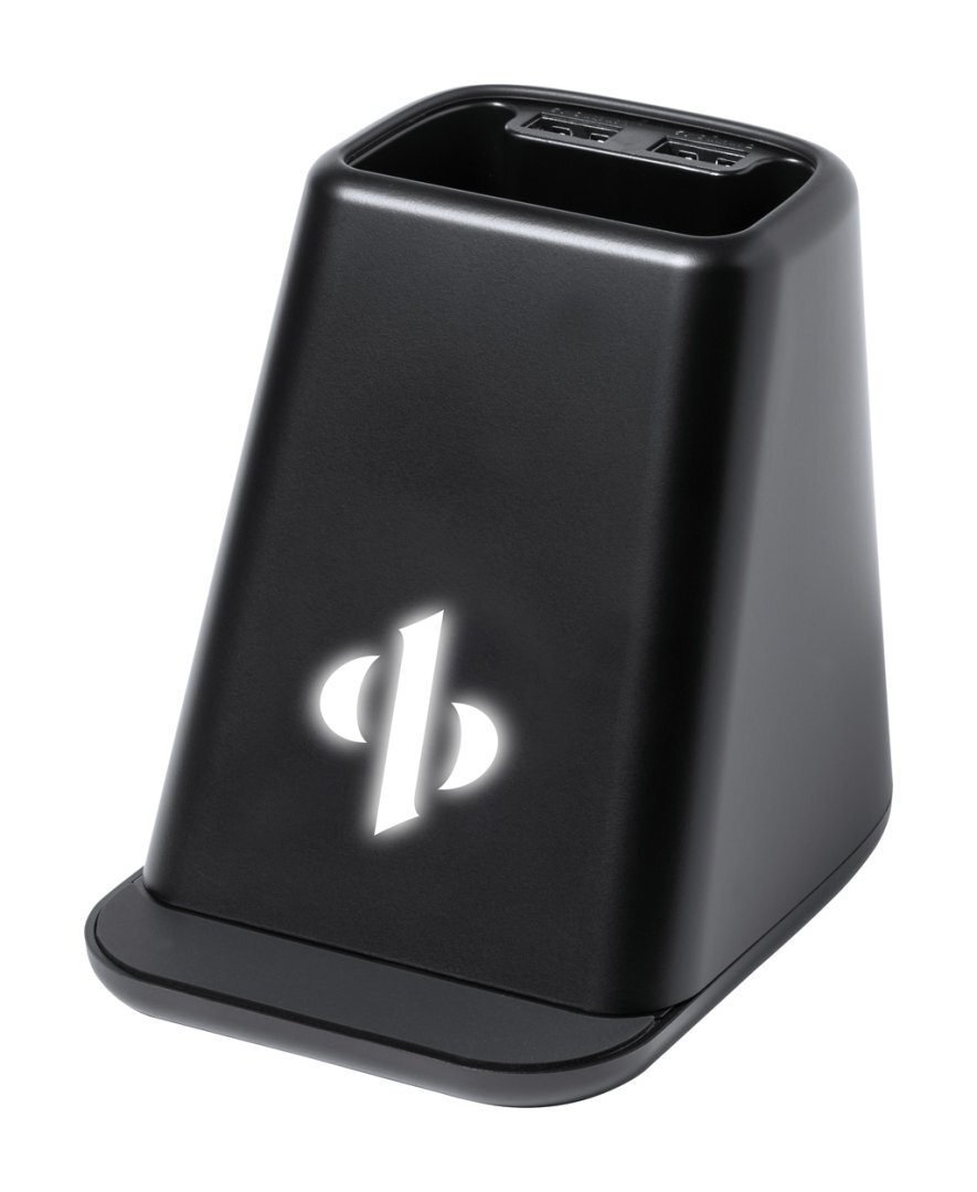Multifunkciós műanyag tolltartó mobiltelefon-tartóval, beépített vezeték nélküli töltővel (15W) és LED fénnyel a megvilágított gravírozáshoz. 2 USB csatlakozóval. USB töltőkábellel szállítjuk.