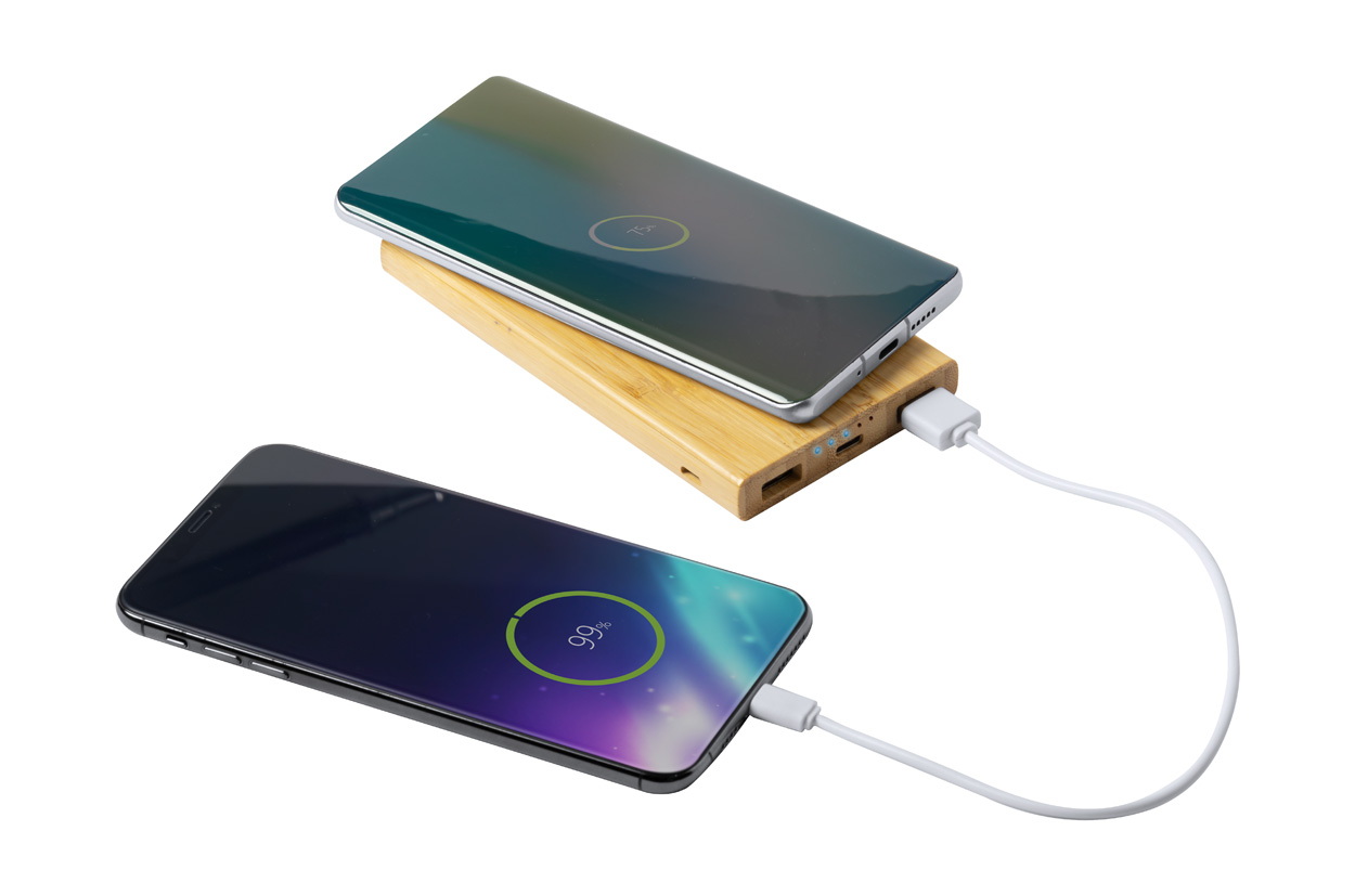 Bambusz USB power bank beépített vezetéknélküli töltővel, 2 porttal és 6000 mAh akkumulátorral.