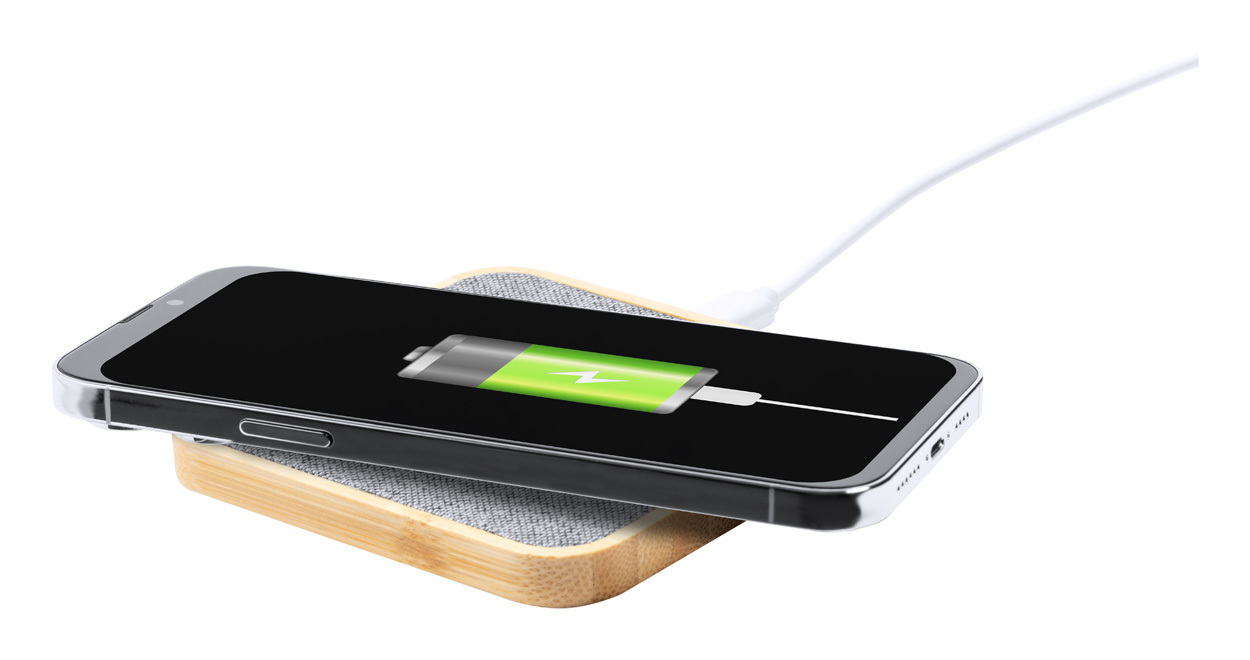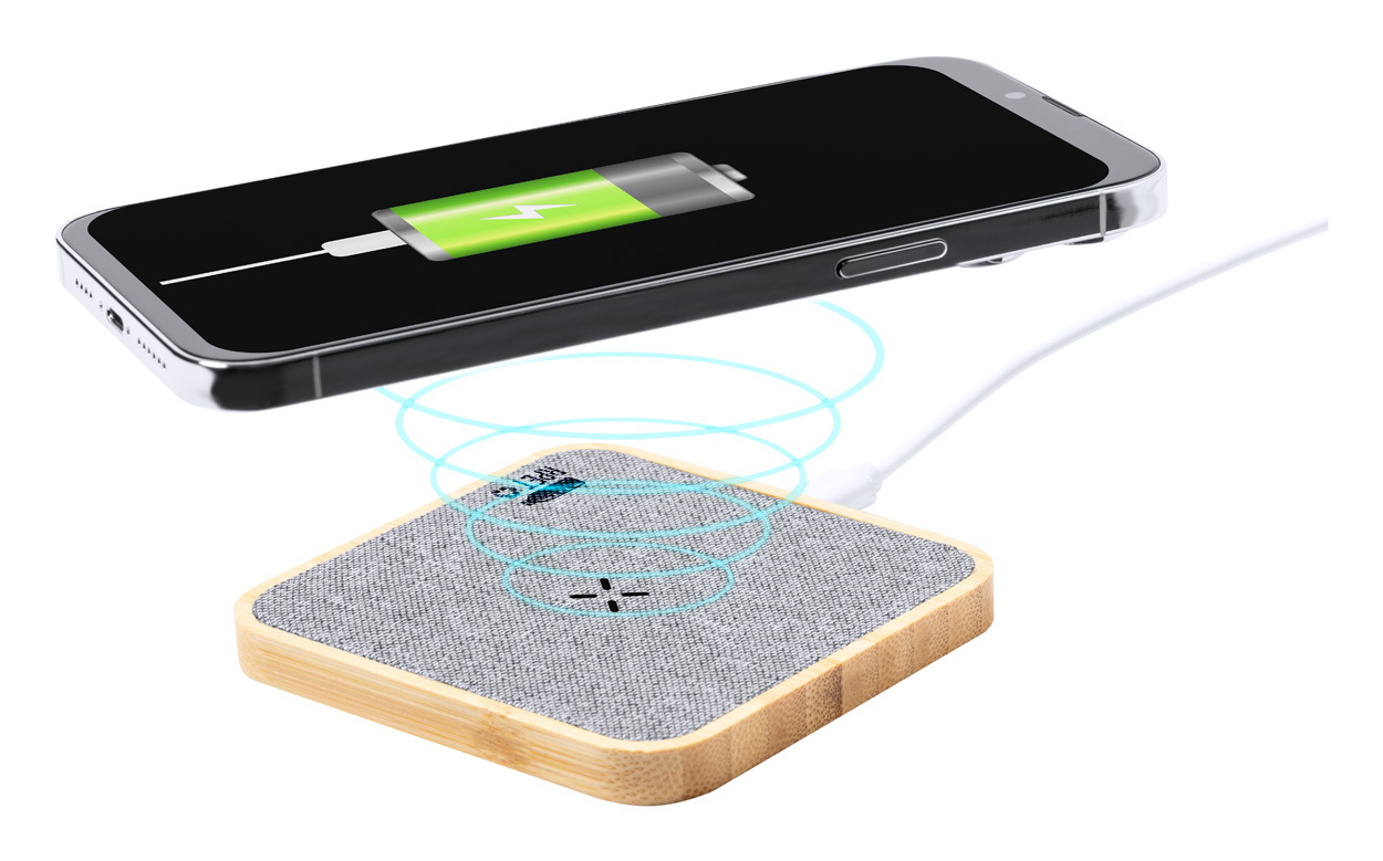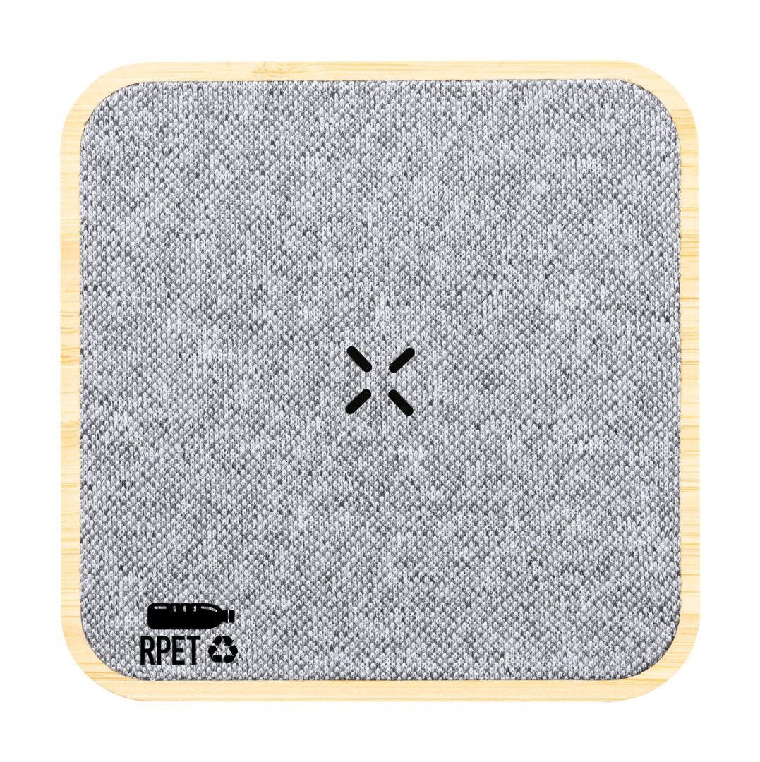 RPET poliészter borítású, vezeték nélküli gyorstöltő (15W) bambusz borítással. USB töltőkábellel szállítjuk.