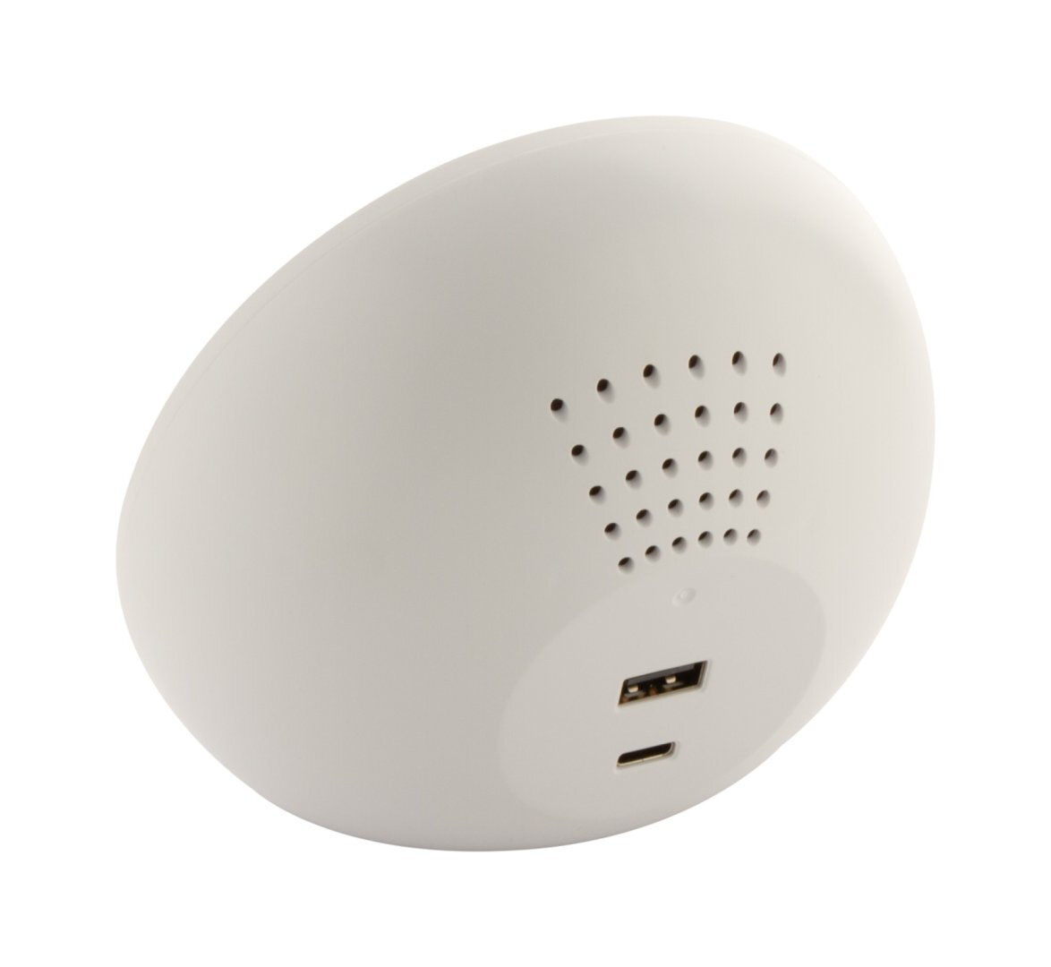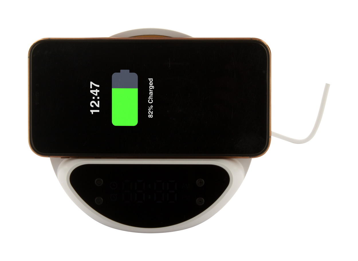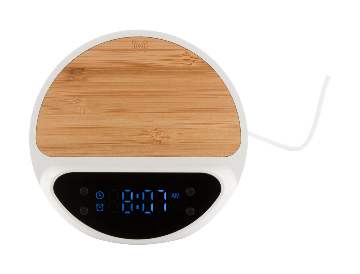 Digitális ébresztőóra újrahasznosított ABS és bambusz borítással, mobiltelefon-tartóval és beépített vezeték nélküli gyorstöltővel (15W). USB töltőkábellel szállítjuk.