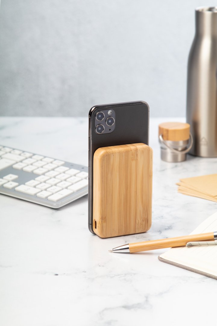 Bambusz power bank félig átlátszó házzal és látható elektronikus alkatrészekkel, beépített mágneses vezeték nélküli gyorstöltővel (10W) és 5000 mAh akkumulátorral. 1 db USB-C töltő csatlakozóval és USB-C bemeneti porttal. Kompatibilis az iPhone® 12 vagy újabb készülékekkel. USB töltőkábellel szállítjuk.