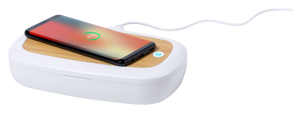 UV-C fertőtlenítő doboz beépített bambusz vezeték nélküli töltővel. A mindennap használatos tárgyakon lévő mikroorganizmusok és baktériumok elpusztítására. Ideális okostelefonokhoz, kulcsokhoz, szemüveghez. 5 és 10 perces sterilizációs időtartam, automatikus kikapcsolási funkcióval.Max. kimenet: 1000 mA. USB töltőkábellel szállítjuk.