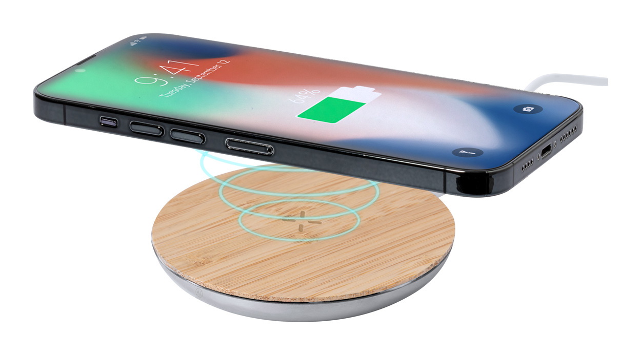 Vezeték nélküli gyorstöltő (15 W) újrahasznosított alumíniumból és bambuszból. USB töltőkábellel szállítjuk.