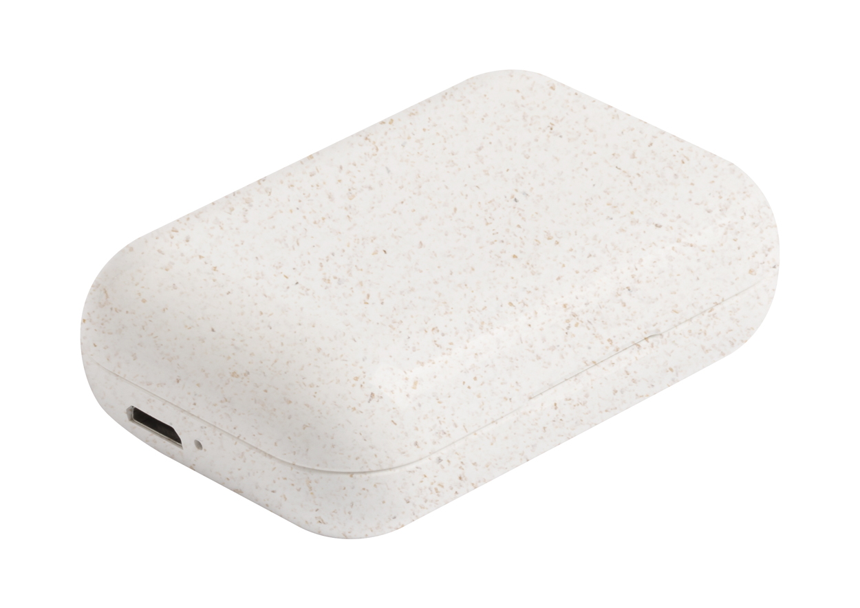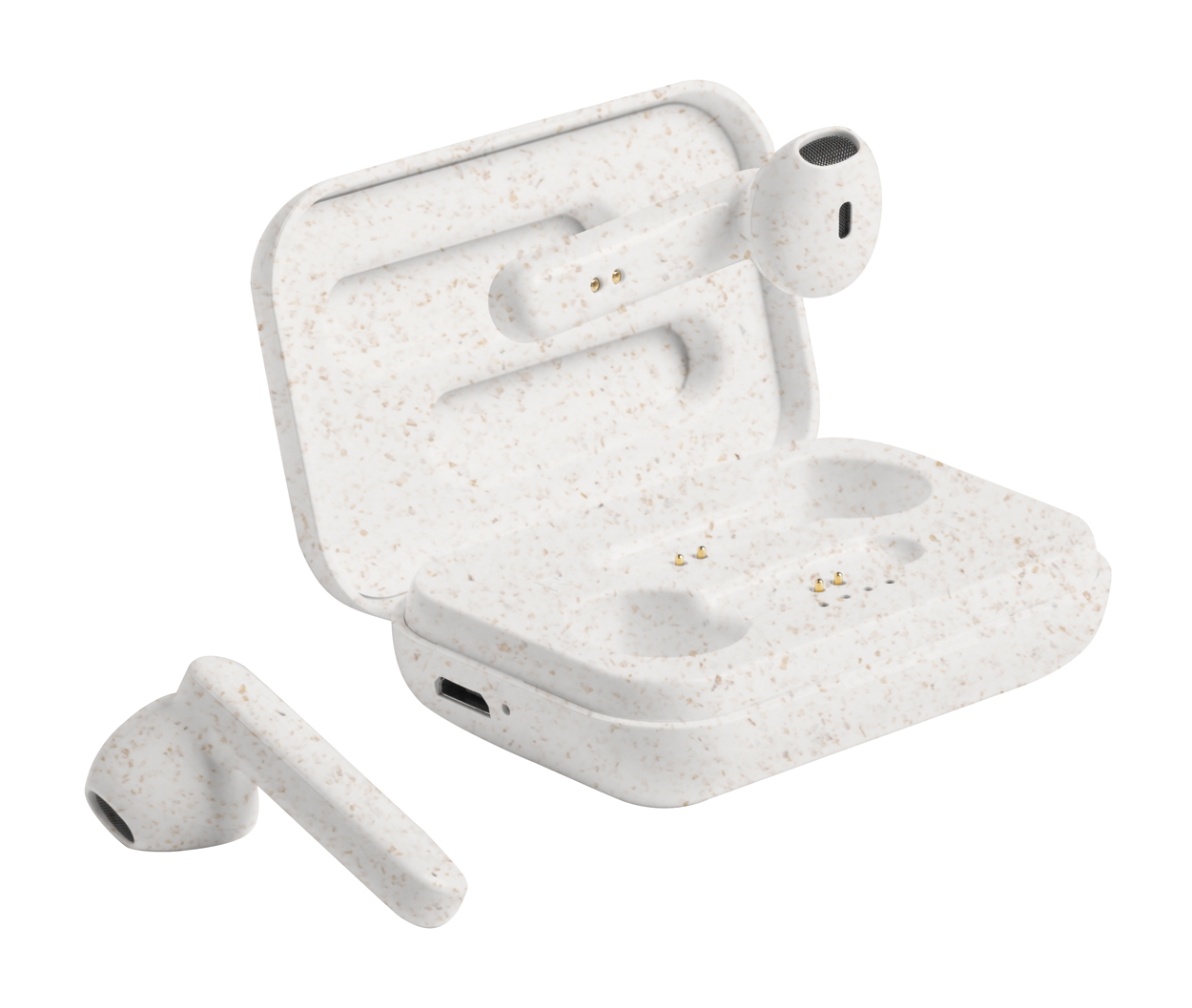 Környezetbarát búzaszalma műanyag, vezeték nélküli fülhallgató kihangosítóval. USB töltő kábellel és nátronpapírban szállítjuk.