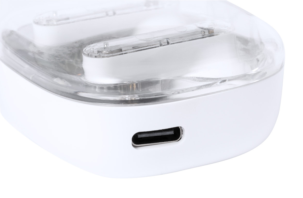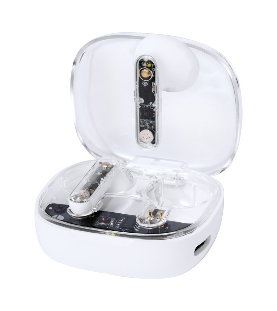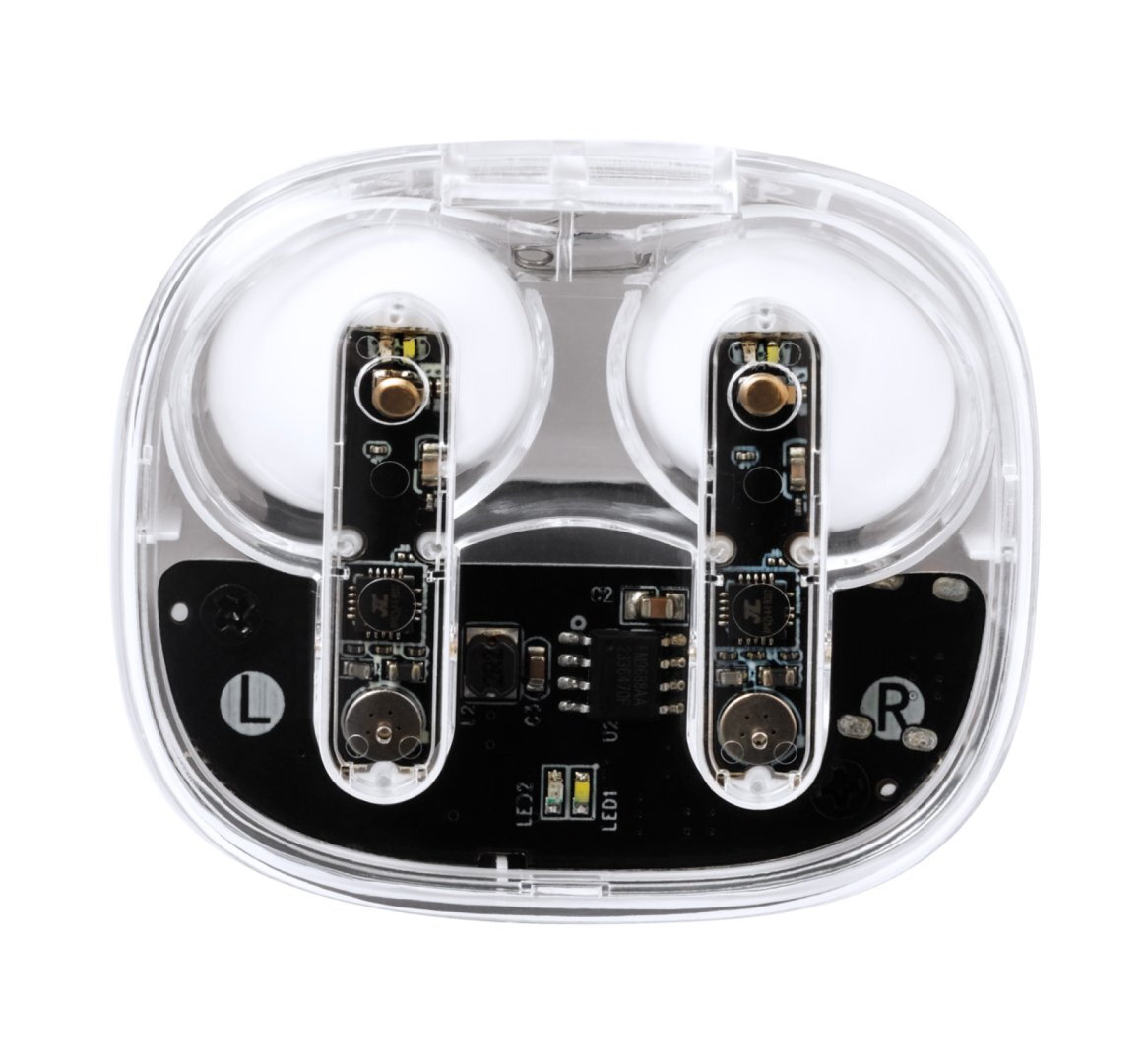 Félig átlátszó, vezeték nélküli bluetooth fülhallgató látható elektronikus alkatrészekkel és kihangosító funkcióval. Félig átlátszó műanyag töltőtokban. USB töltőkábellel szállítjuk.