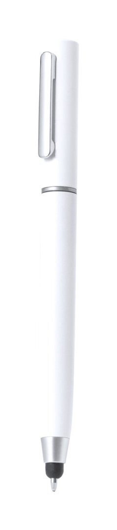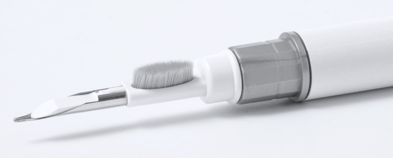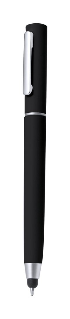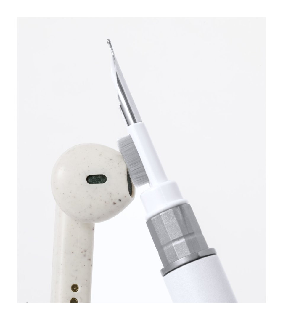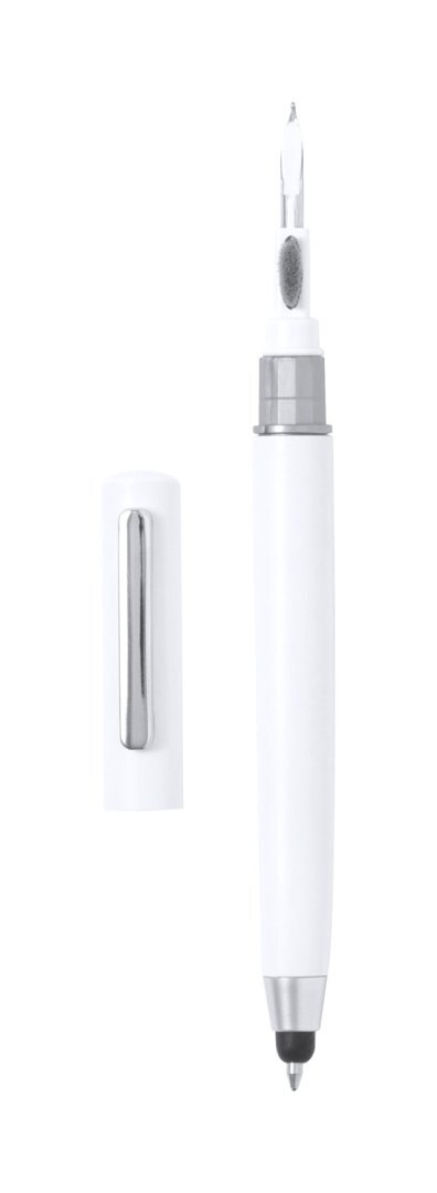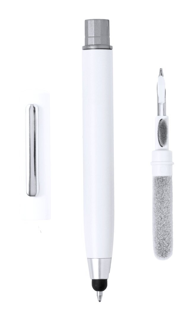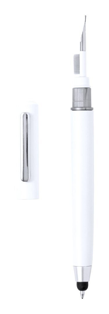 ABS műanyag tekerős golyóstoll és érintőképernyős toll beépített fülhallgató-tisztító készlettel. Kék tollbetéttel szállítjuk.