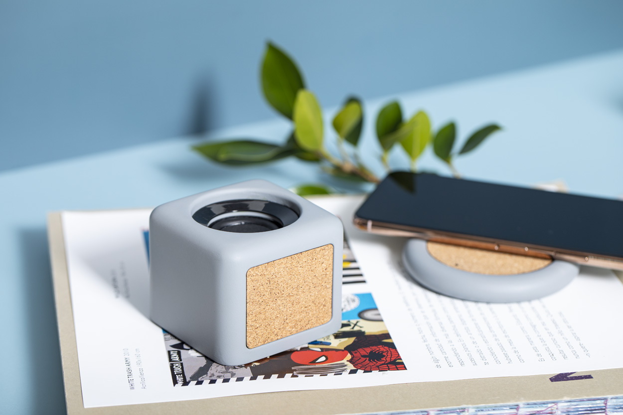 Bluetooth hangszóró mészkőcement és természetes parafa vázzal és beépített akkumulátorral. USB töltőkábellel szállítjuk.