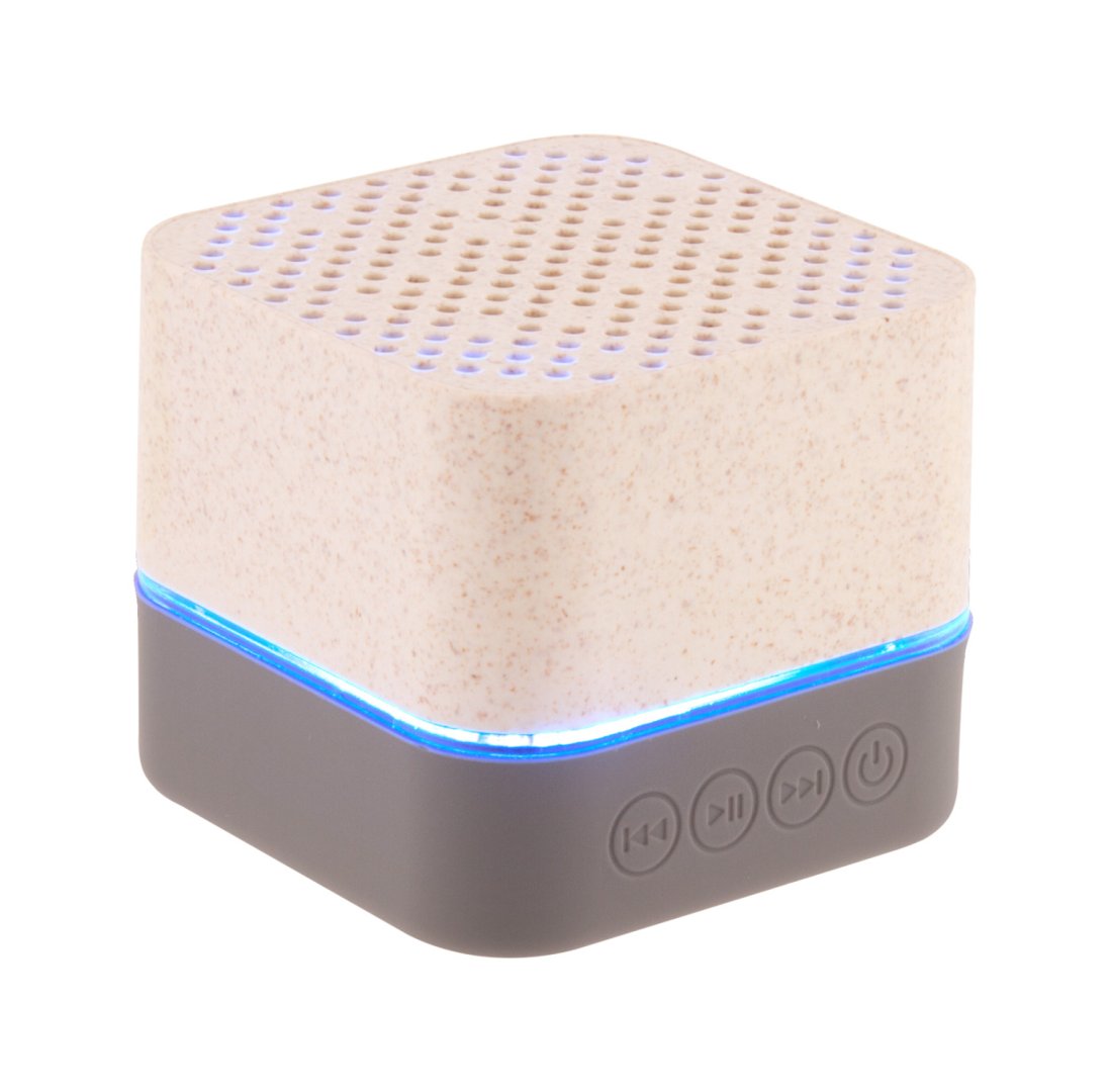 Bluetooth hangszóró környezetbarát búzaszalma műanyag borítással, gumis alsó résszel, többszínű LED világítással és beépített újratölthető akkumulátorral. Micro SD lejátszóval és kihangosító funkcióval. USB töltőkábellel szállítjuk.