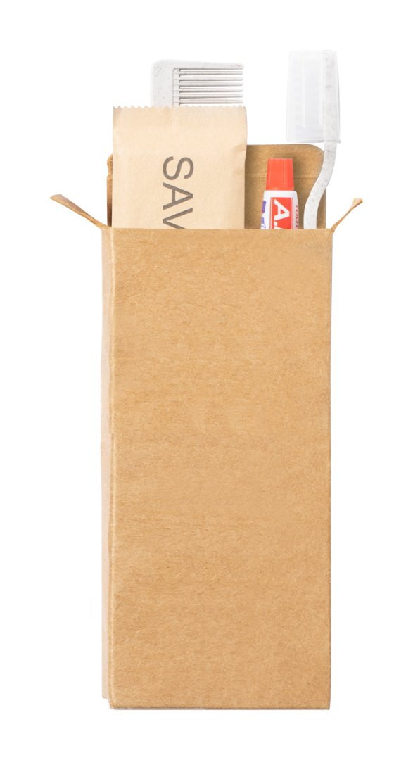 4 db-os kozmetikai szett, mely egy búzaszalma műanyag fogkefét, egy fogkrémet, egy fésűt és egy szappant tartalmaz. Kraft papír dobozban.