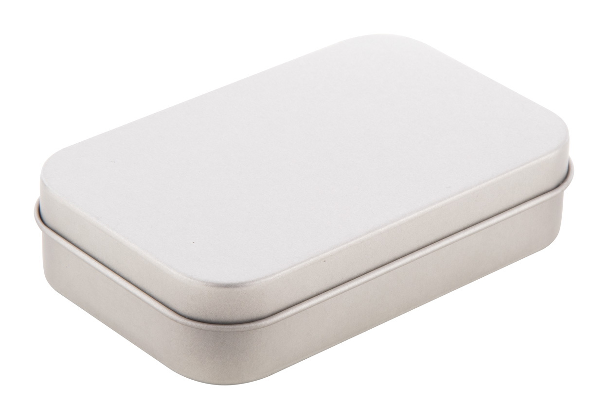 Kompakt elsősegély készlet fémdobozban. Tartalma: olló, 1 ragasztószalag, 1 törlőkendőt, 1 géz kötszer, 3 öntapadós kötszer és 3 biztosítótű.