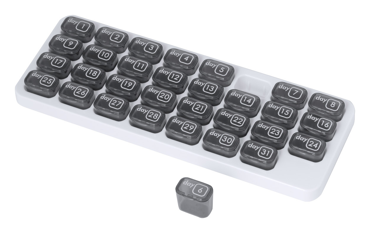 Billentyűzet formájú, PP műanyag gyógyszeradagoló doboz 31 rekesszel.