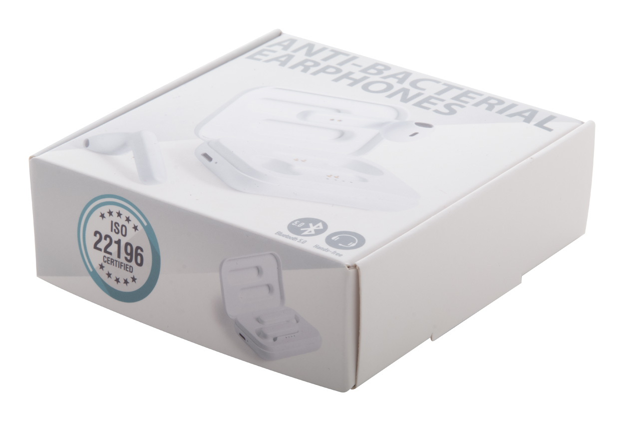 Antibakteriális műanyag, vezeték nélküli bluetooth fülhallgató kihangosítóval és töltőtokkal. ISO 22196 megfelelőségű. USB töltőkábellel szállítjuk.