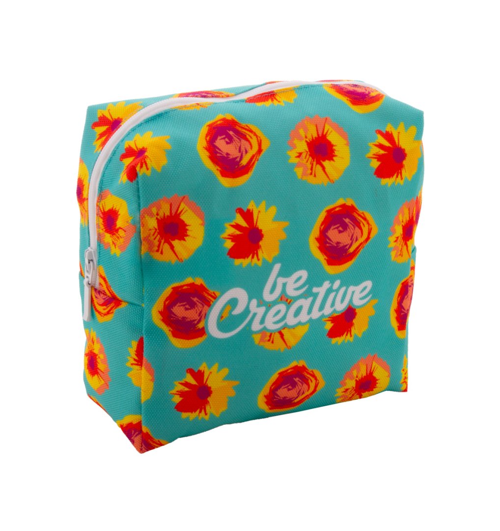 Egyedi gyártású, négyzet alakú, cipzáras 600D RPET poliészter kozmetikai táska. Az ár tartalmazza a szublimációs emblémázás költségét a termék mindkét oldalán. Minimális rendelési mennyiség: 50 db.