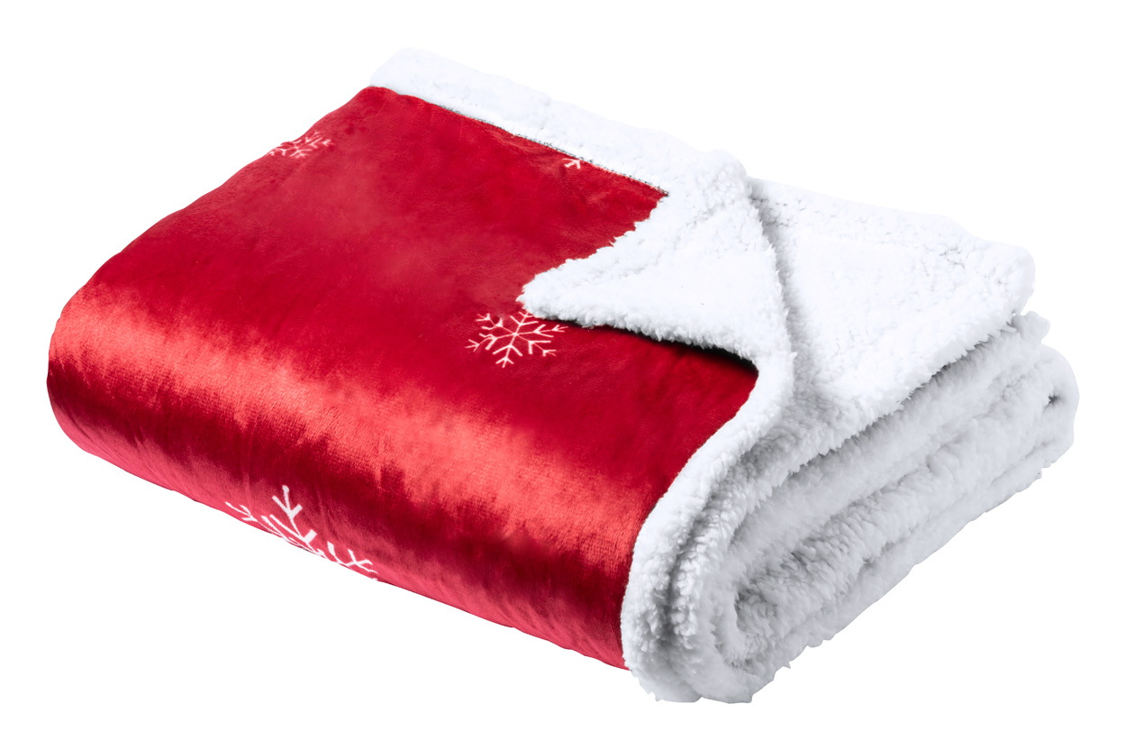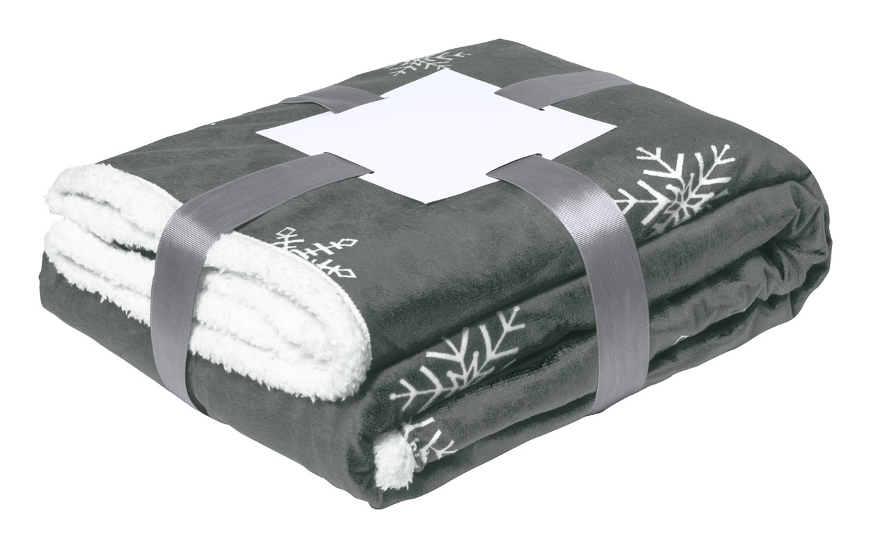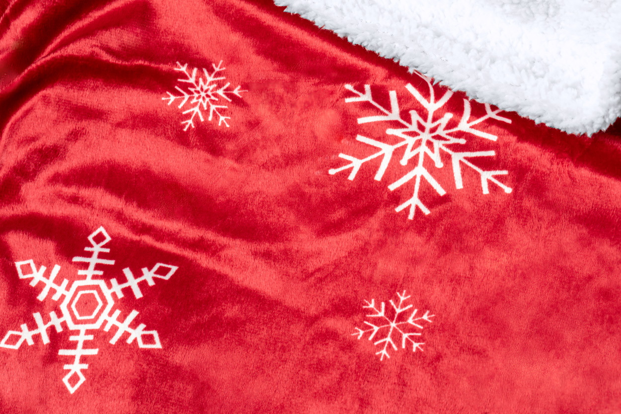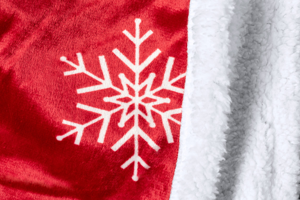 Kétrétegű karácsonyi takaró gyapjú és sherpa anyagból, hópehely mintával, 380 g/m². Szalaggal átkötve, nyomtatható papírkártyával szállítjuk.