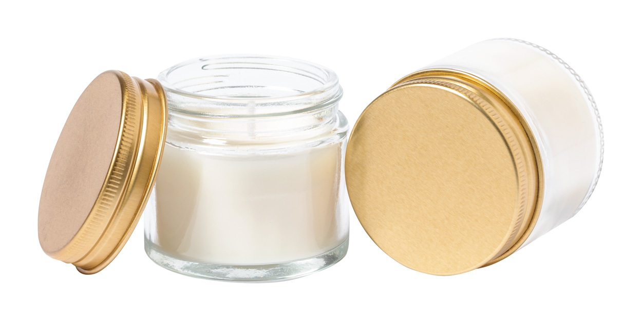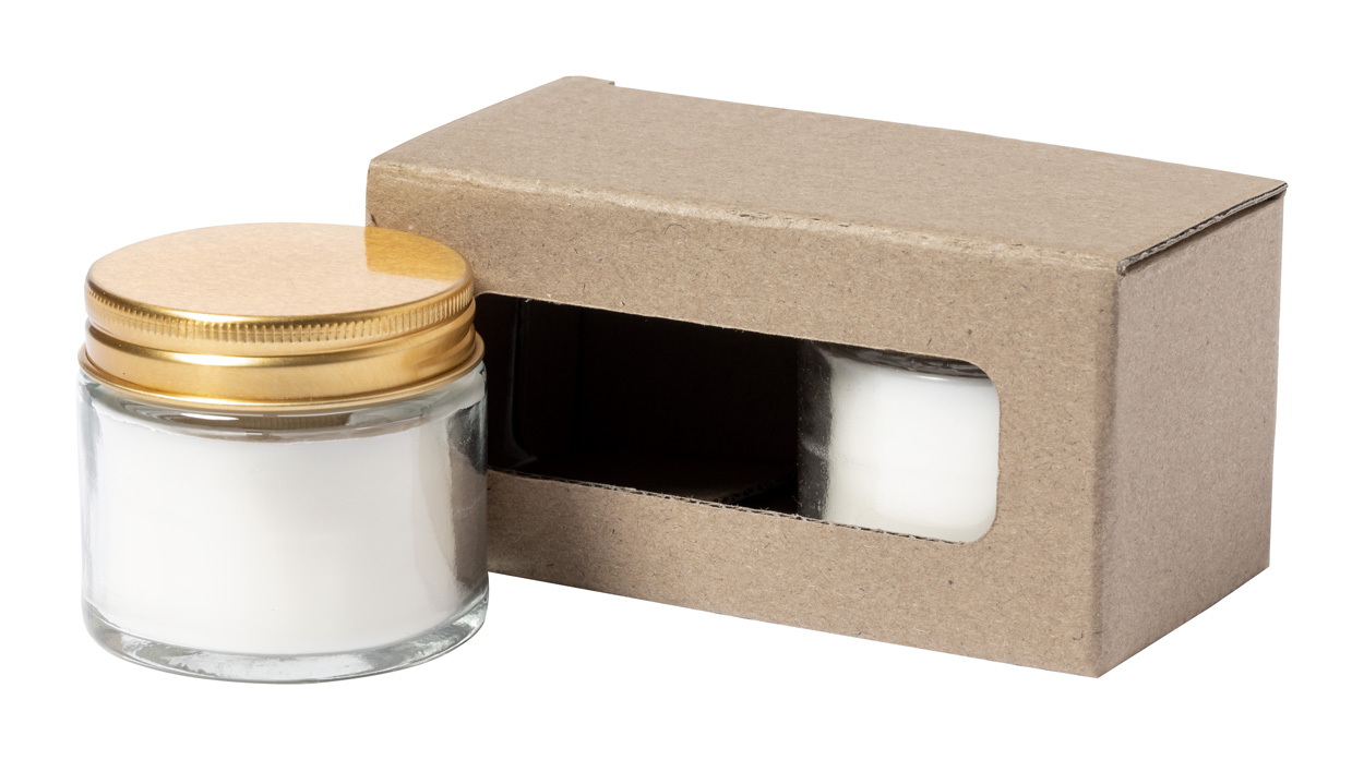2 darab növényi alapú viaszgyertya üveg tárolóban, fém tetővel. Kraft papír dobozban.