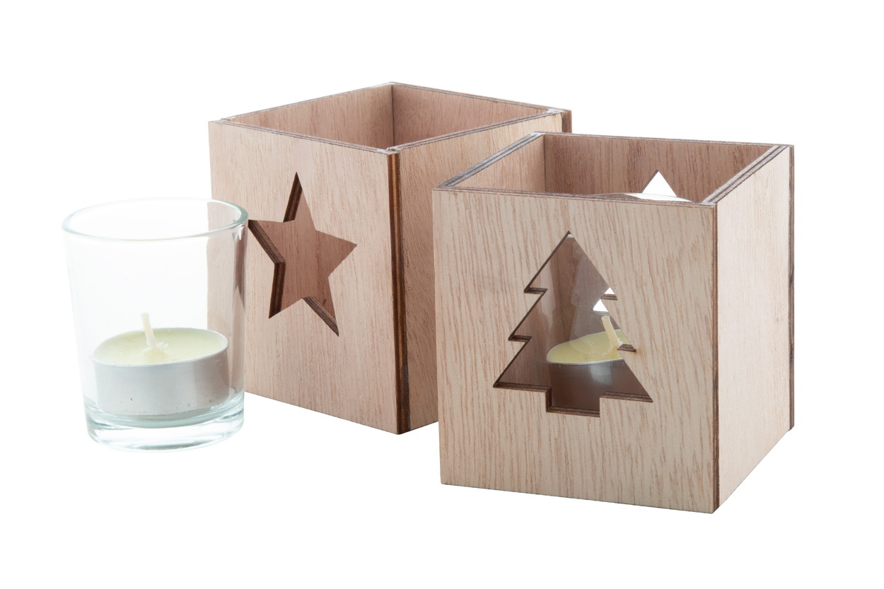 Vanília illatú teamécses üvegedényben és fa gyertyatartóban, kivágott karácsonyi motívummal.