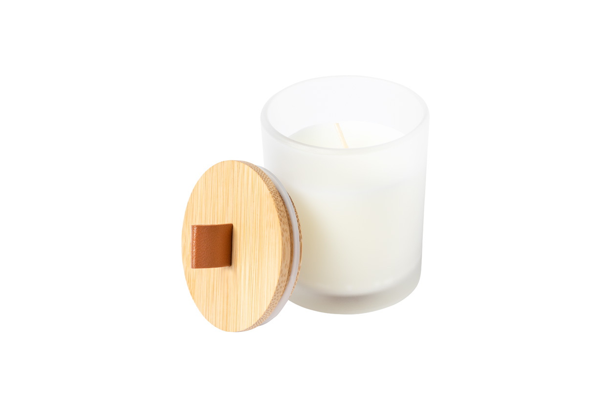 Növényi alapú illatgyertya homokfúvott üvegtartóban, bambusz tetővel.