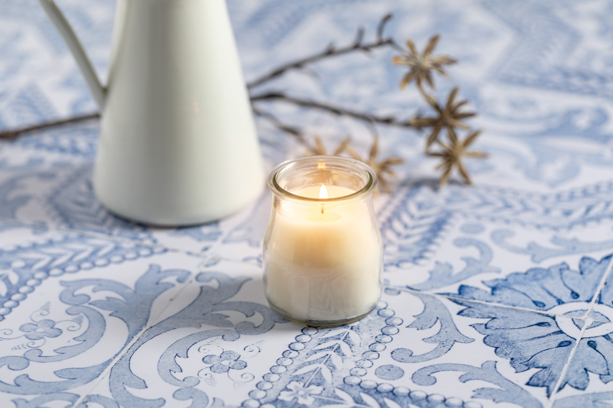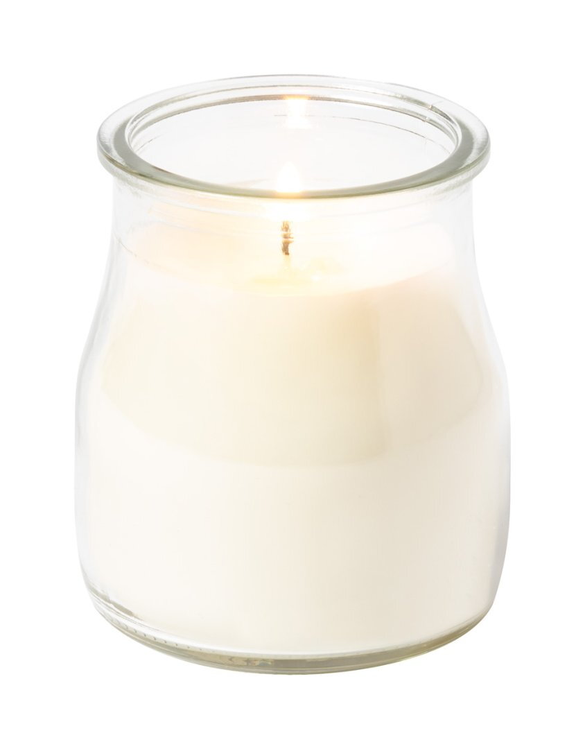 Illatos gyertya üveg tartóban.