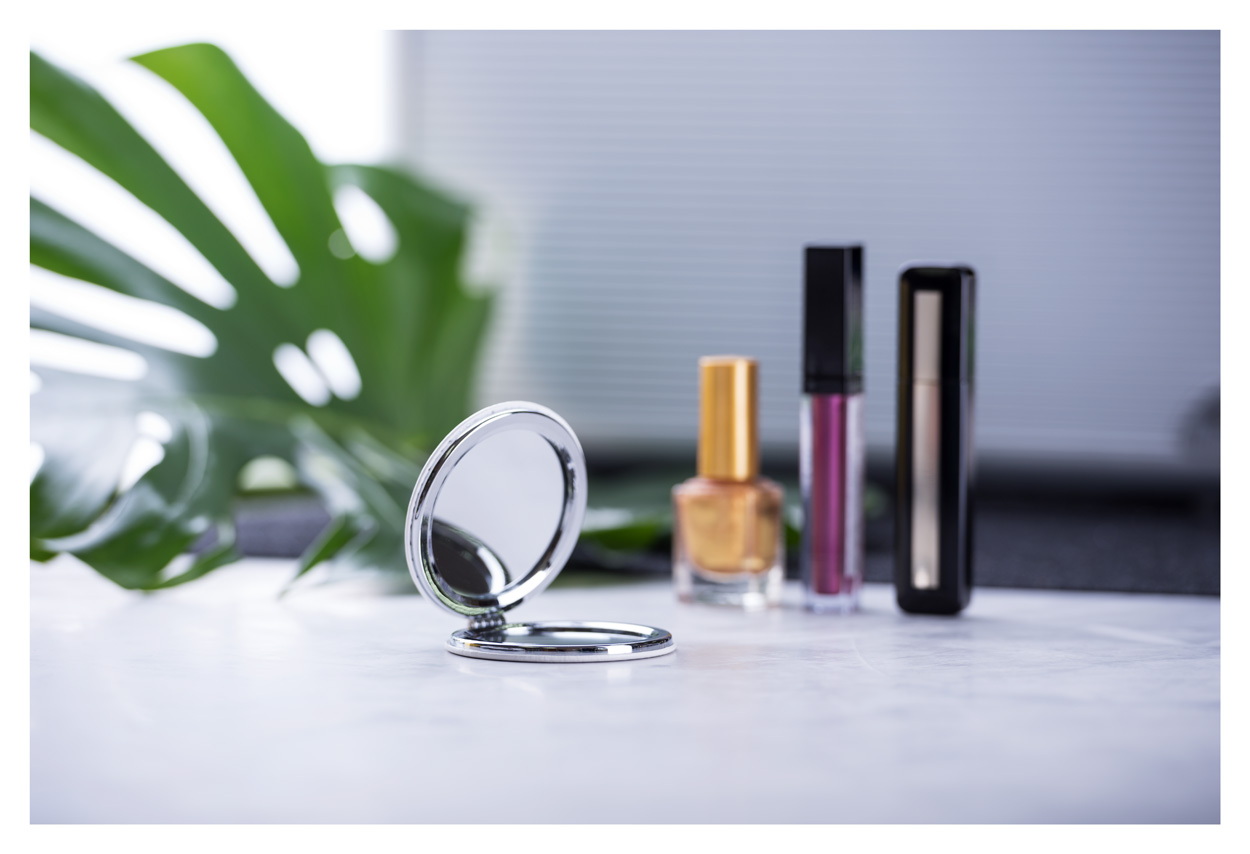 Műbőr borítású zsebtükör egy normál és egy nagyító tükörrel.